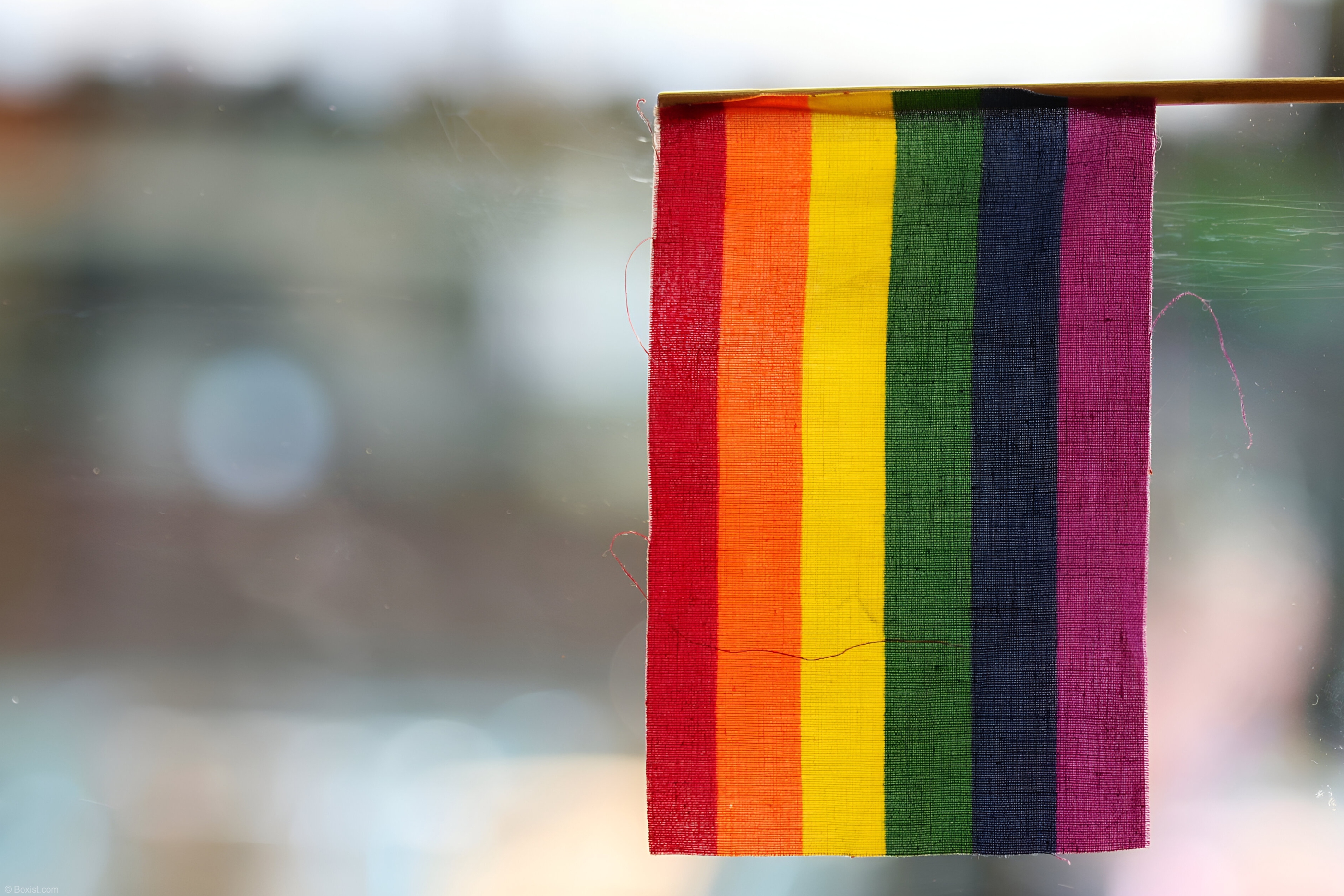 The image showcases a small, handmade rainbow flag, held up against a blurred background. The flag’s vibrant colors symbolize diversity, inclusivity, and LGBTQ+ pride. It is a powerful visual symbol that represents acceptance, equality, and celebration of different identities and orientations. The flag is composed of vertical stripes in the colors of the rainbow, from left to right: red, orange, yellow, green, blue, and purple. The fabric appears to be somewhat textured, with visible threads and a slightly rough surface. The edges of the flag are frayed, adding to its handcrafted appearance. The flag is attached to a thin, wooden stick, likely a small dowel. The stick is positioned horizontally at the top of the flag, holding it up. The background is out of focus, suggesting a shallow depth of field. The blur creates a soft, airy feel and prevents the viewer from being distracted by the scene behind the flag. Hints of light and color can be seen within the background, indicating an outdoor setting. The lighting appears to be natural, possibly daylight, casting a soft glow on the flag. The composition is simple, with the flag taking center stage and the blurred background providing context without drawing focus away from the main subject. The overall feel is positive and celebratory, given the symbolism of the rainbow flag.