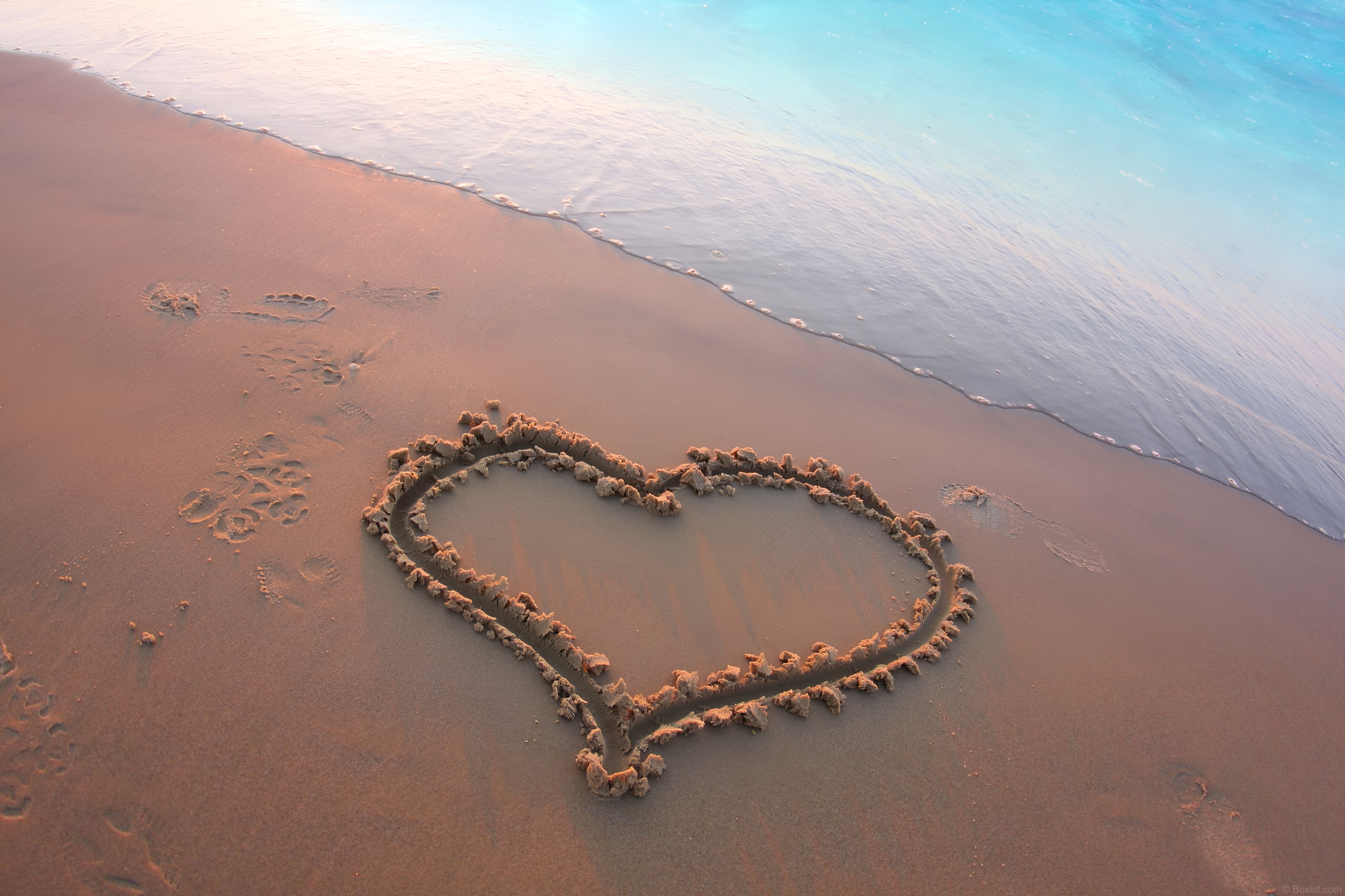 The image captures a serene beach scene with a heart drawn in the sand. The sand is a warm, sandy-brown color, which contrasts with the cooler tones of the water. The sea occupies the top portion of the image, with the water gradually shifting in color from a light turquoise near the horizon to a soft white where it meets the shore. The waves are gently lapping against the sand, their foamy edges creating a soft, blurred line. The wet sand near the water’s edge reflects the light, adding a subtle sheen to the scene. The composition is well-balanced, with the heart positioned slightly off-center, drawing the viewer’s eye. The angle provides a wide view of the scene, suggesting a calm and peaceful atmosphere. There are also several footprints on the sand, scattered across the beach, hinting at human presence and recent activity. The overall color palette is dominated by soft, natural tones, creating a soothing and romantic mood. The lighting suggests either sunrise or sunset, with the warm hues of the sand and the sky enhancing the emotional quality of the image.